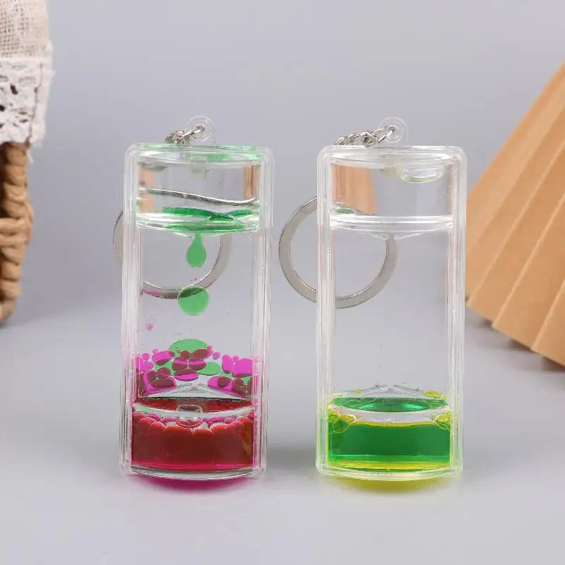 Ce porte-clés se distingue par son sablier liquide dynamique, une capsule transparente où des gouttes colorées descendent en formant des motifs changeants et fascinants. Contrairement aux sabliers traditionnels remplis de sable, celui-ci utilise des liquides colorés qui se déplacent avec fluidité, créant des bulles hypnotiques. Chaque retournement donne naissance à une nouvelle danse de couleurs, rendant l’objet toujours surprenant et agréable à observer.